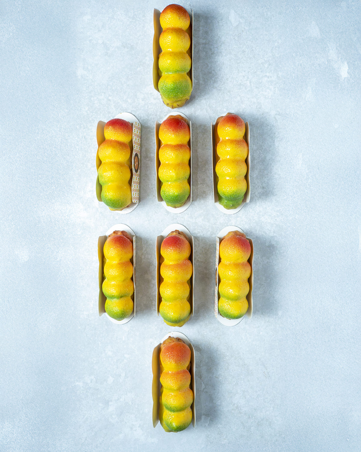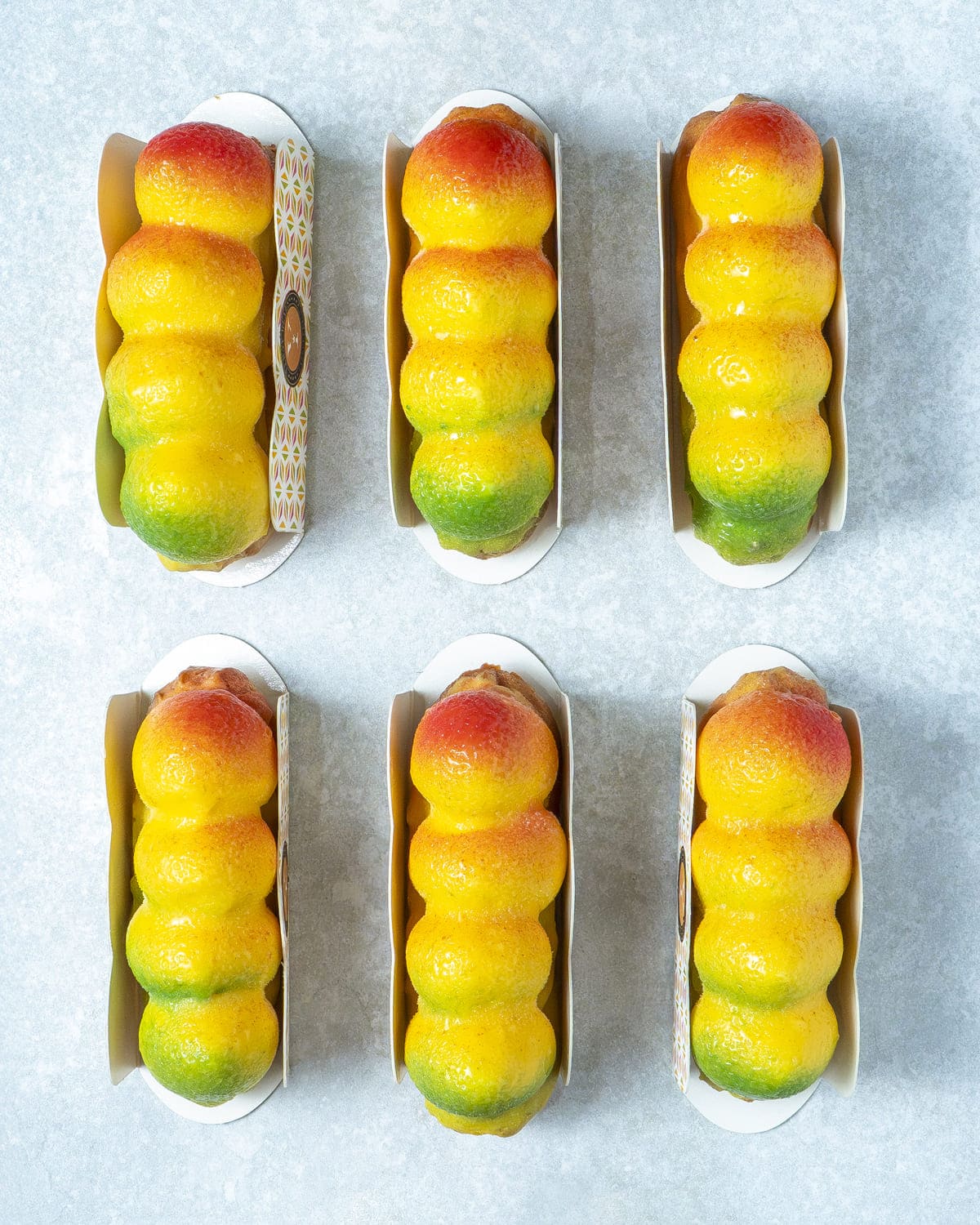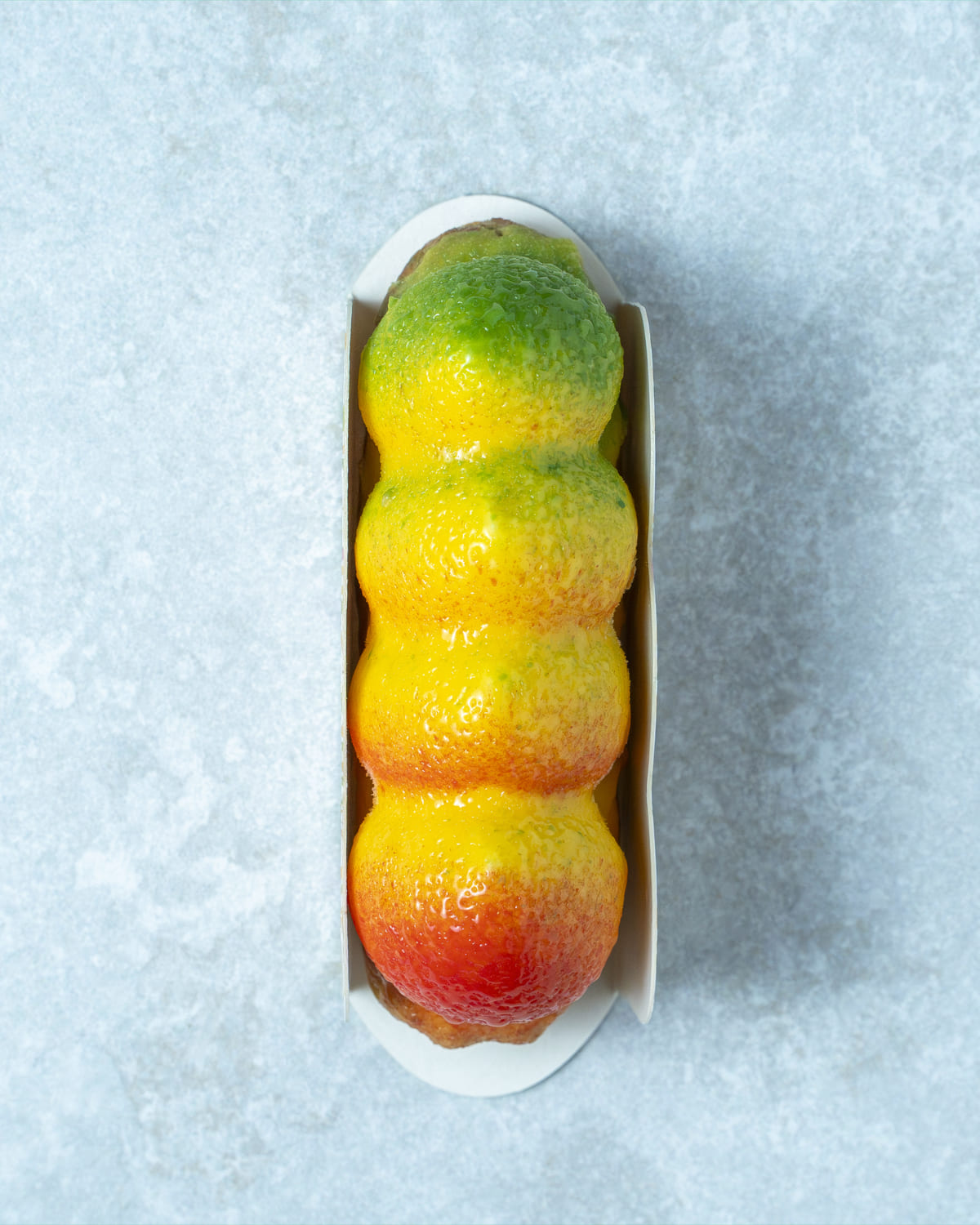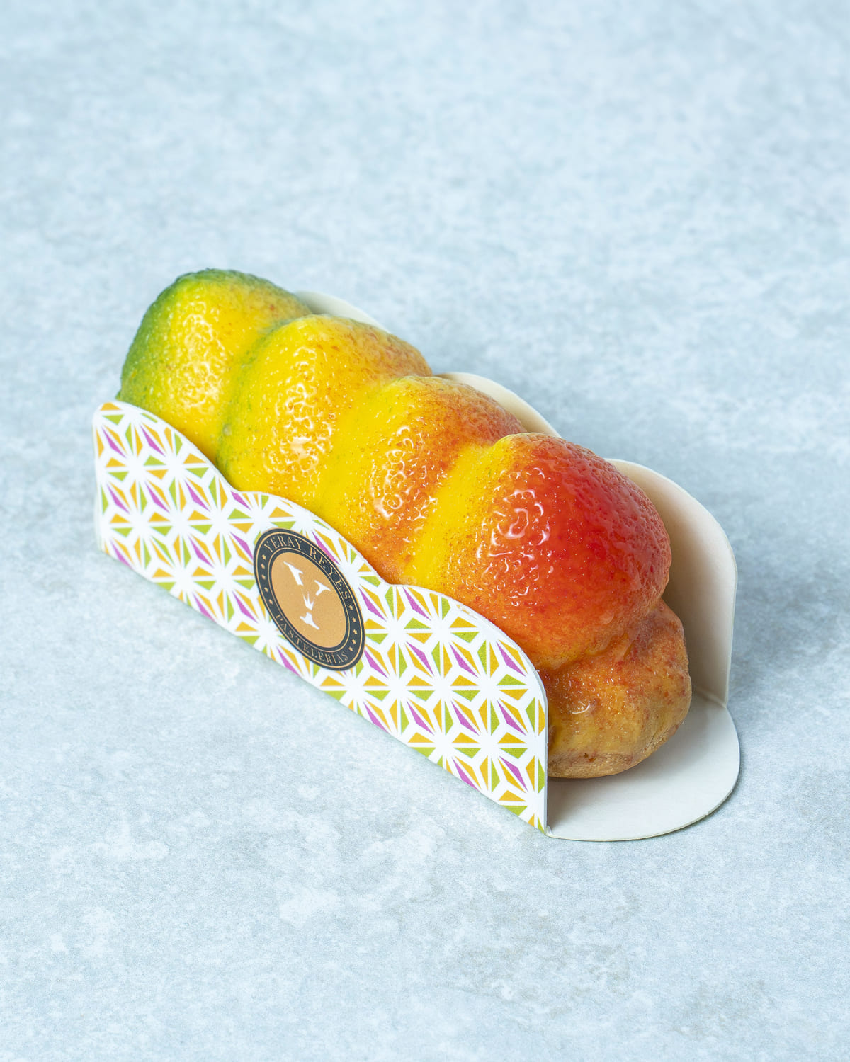 Namelaka y compota de mango con crujiente de galleta.
