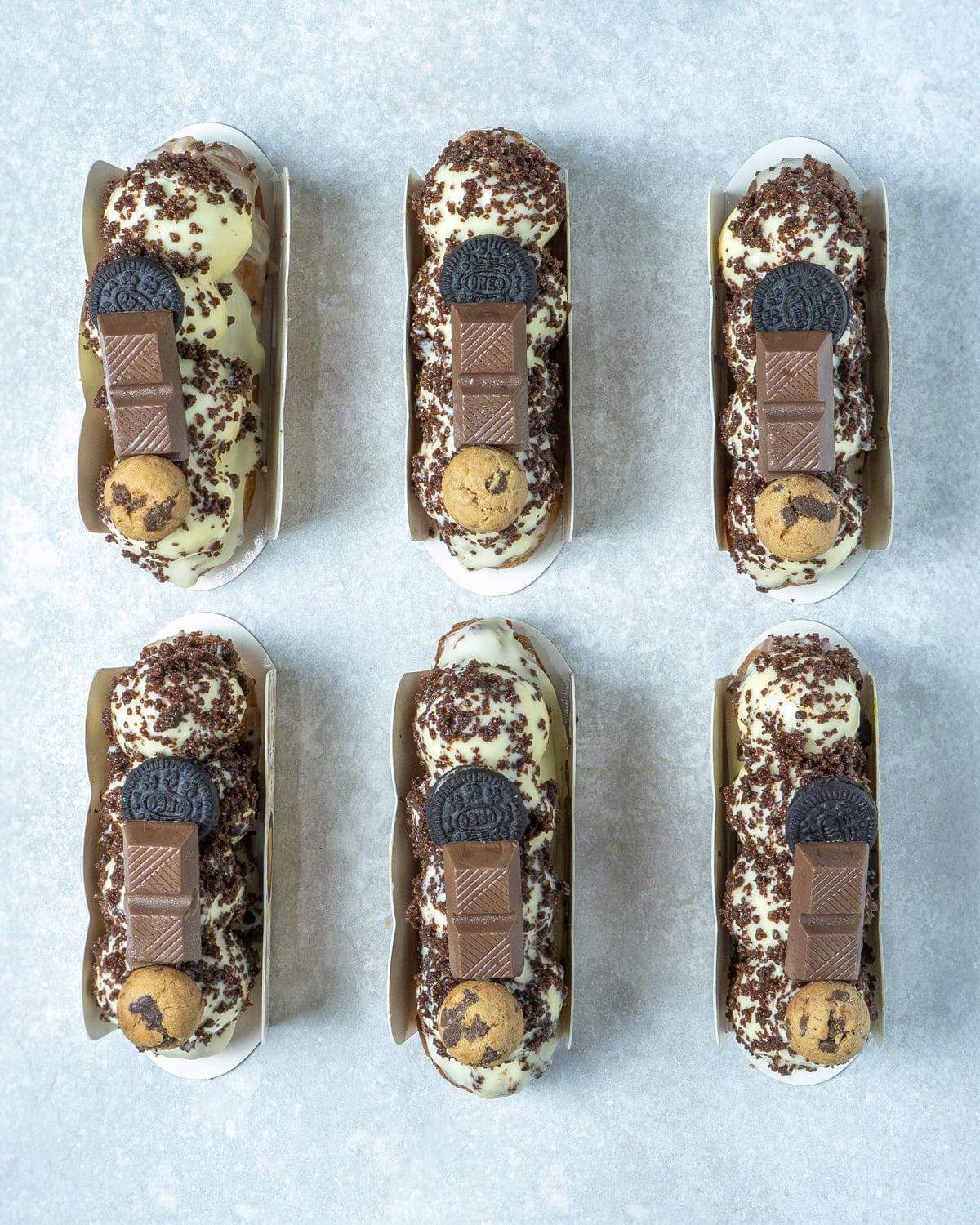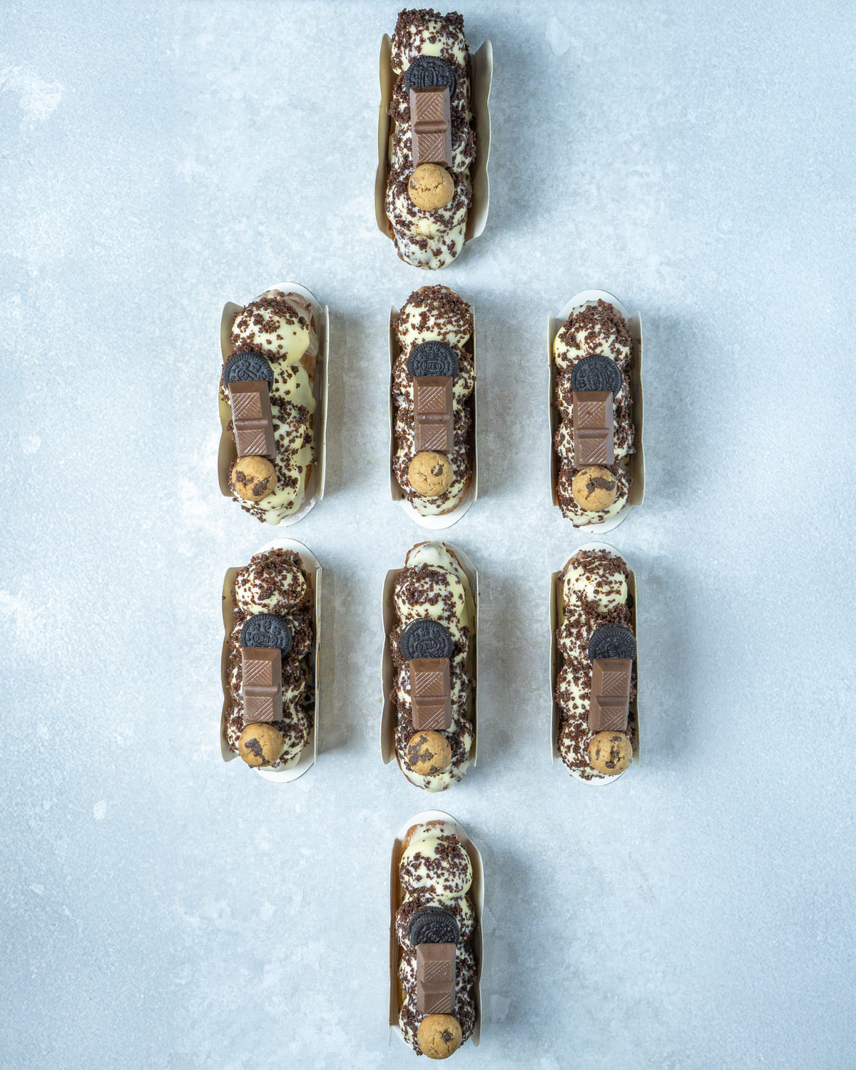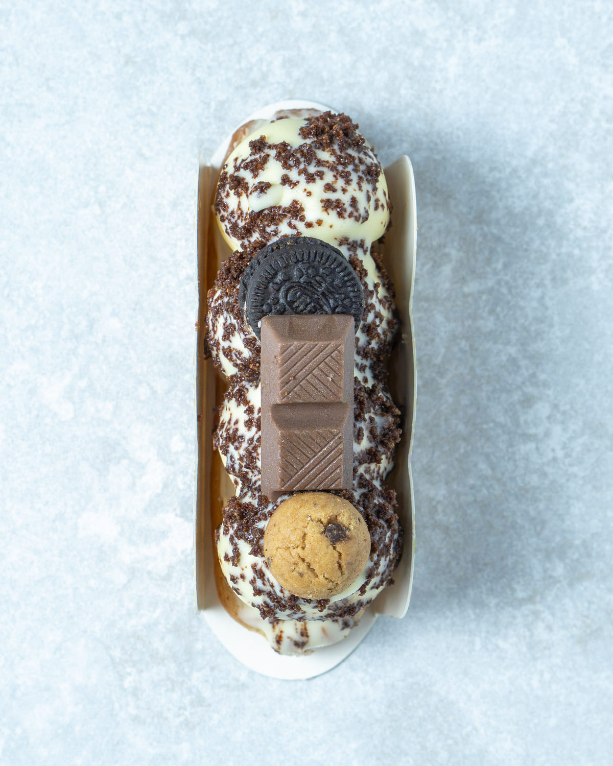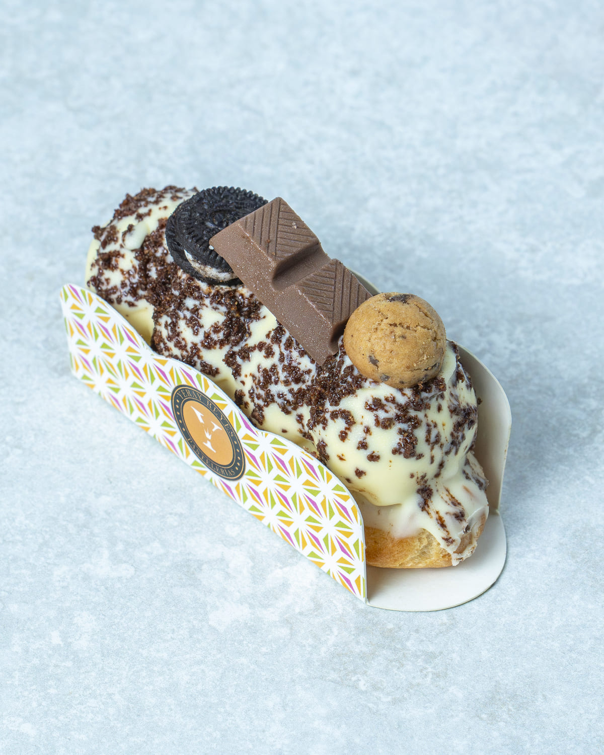 Namelaka y crujiente de avellana con barquillo bañada en chocolate blanco.