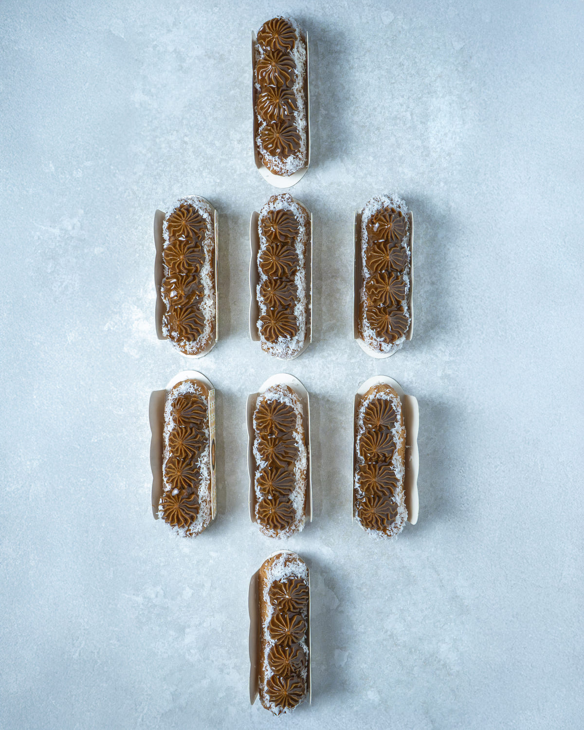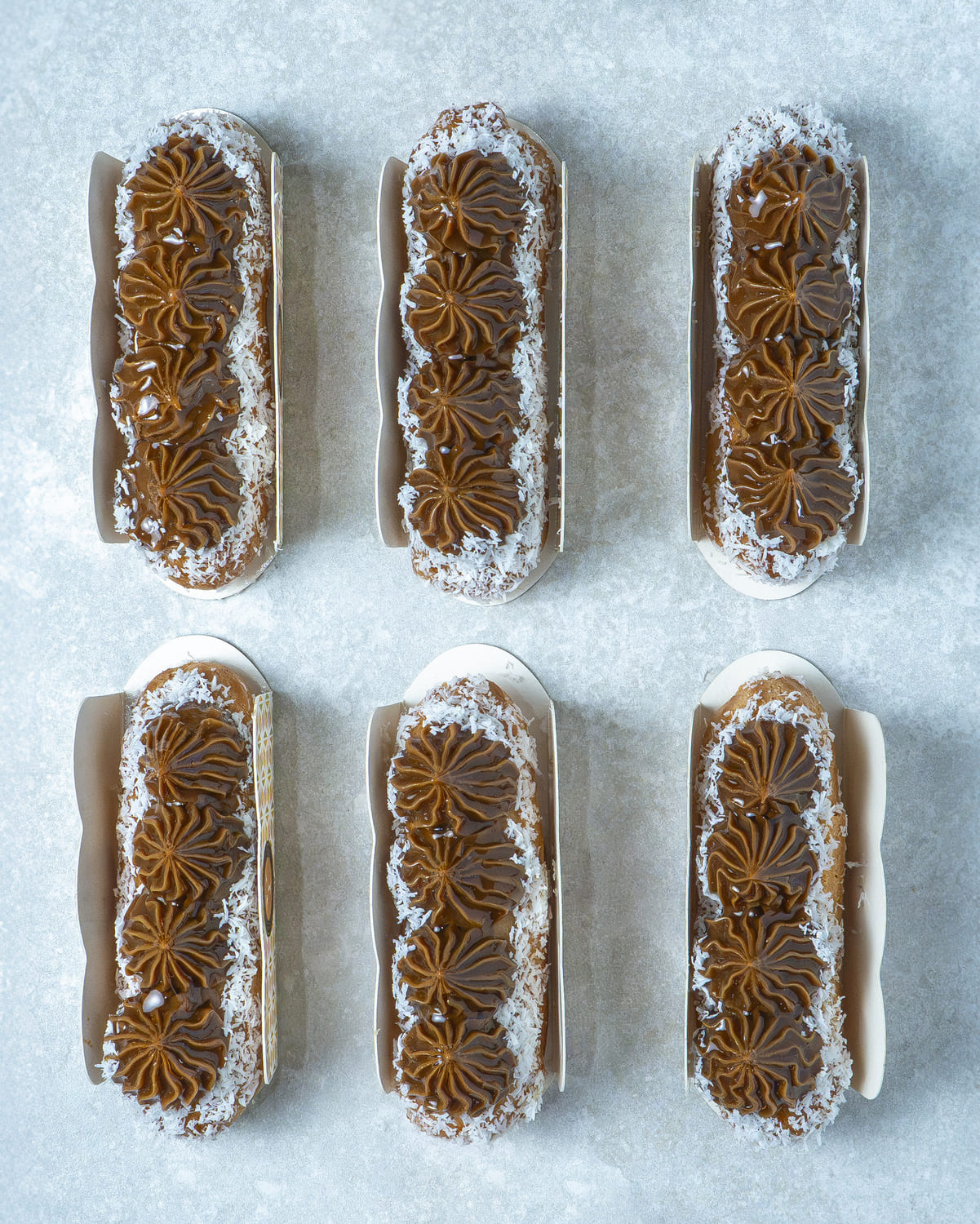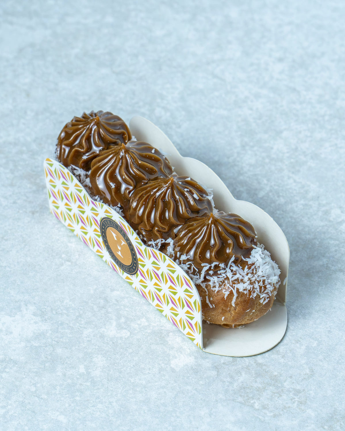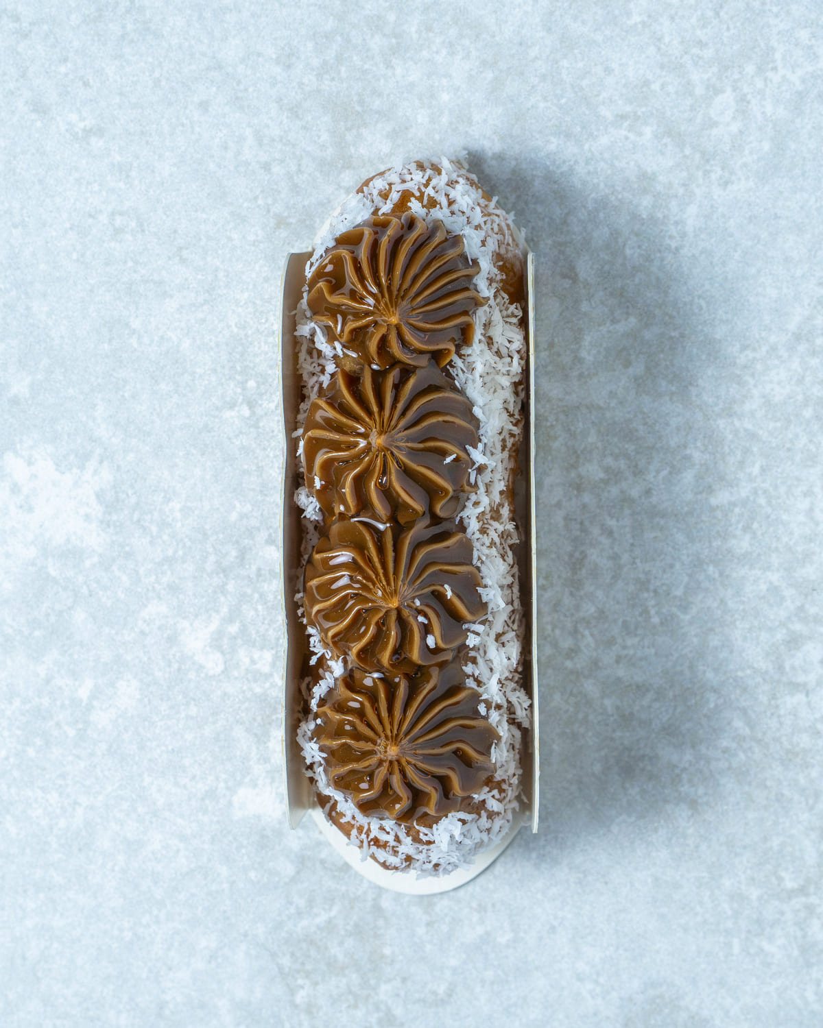 Cremoso de vainilla, dulce de leche y coco rallado.