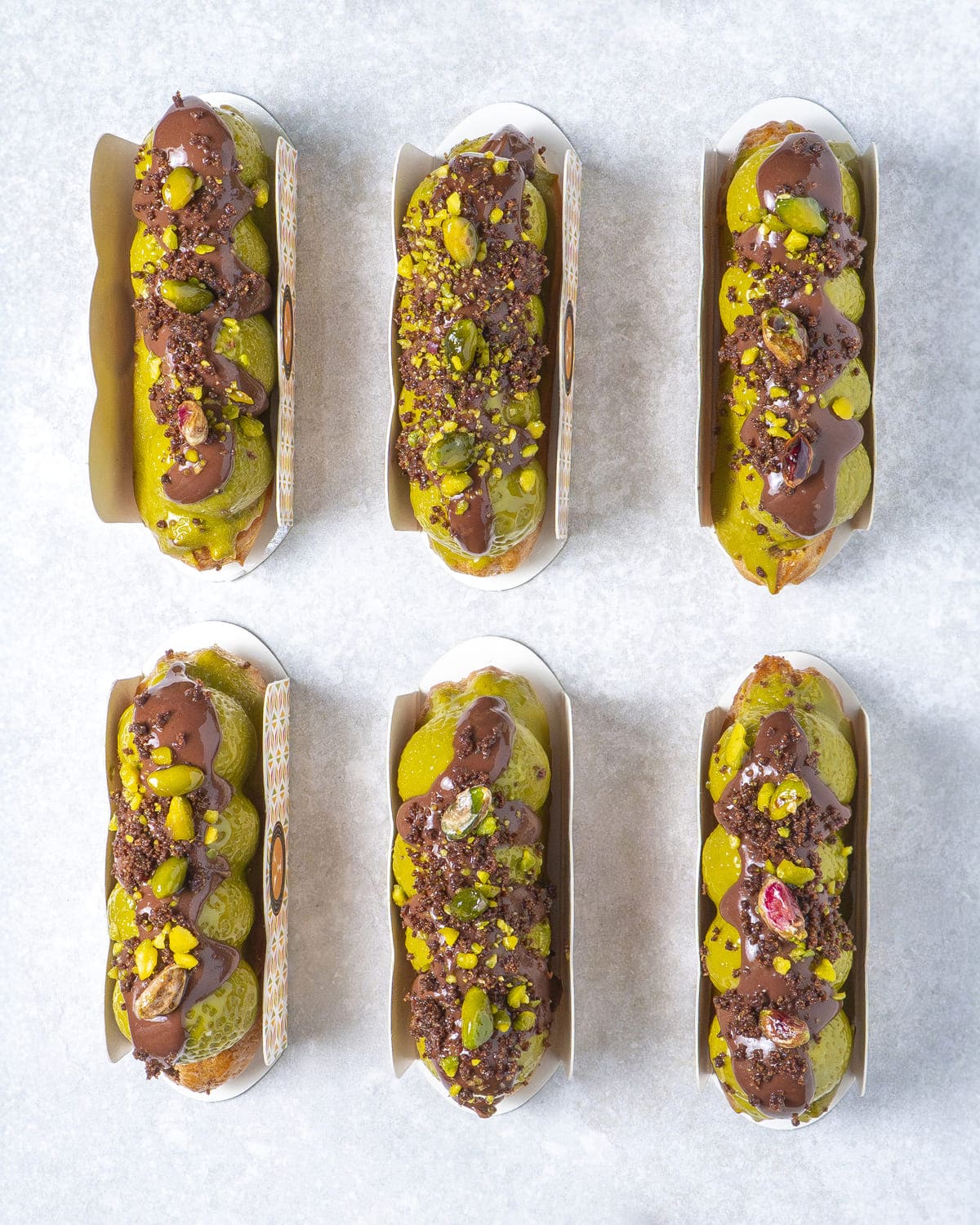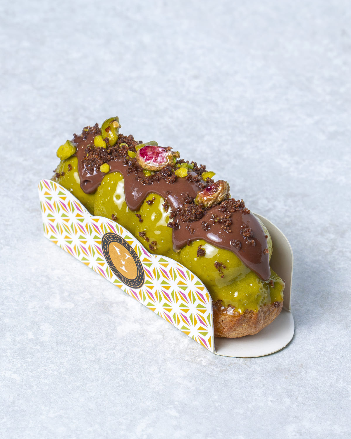 Namelaka de chocolate y praliné de pistacho con kataifi.
