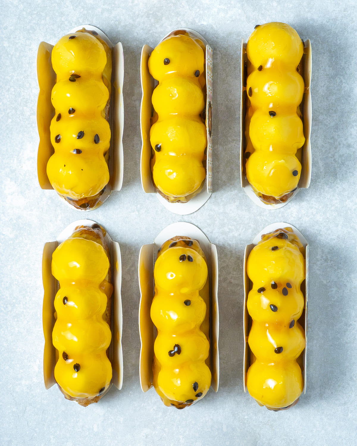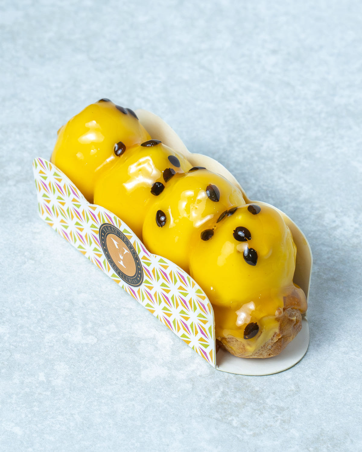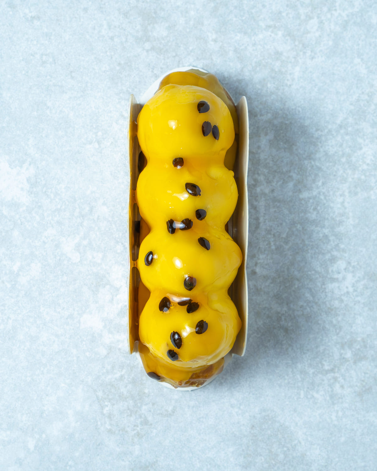 Namelaka de yogur, compota de maracuyá y ganache montada en vainilla.