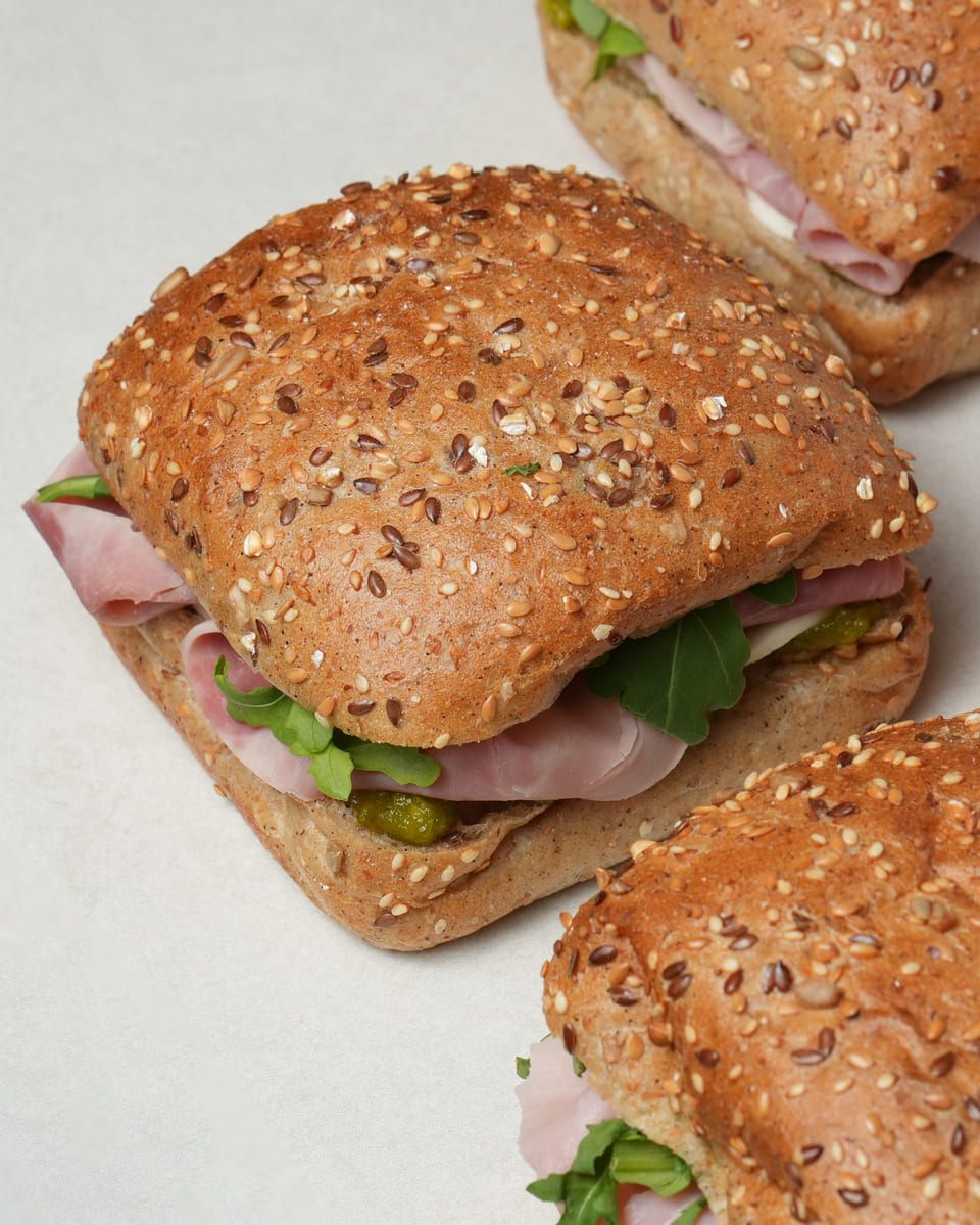 Pan integral con semillas, ibérico, tumaca con aceite de oliva.
