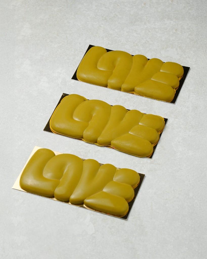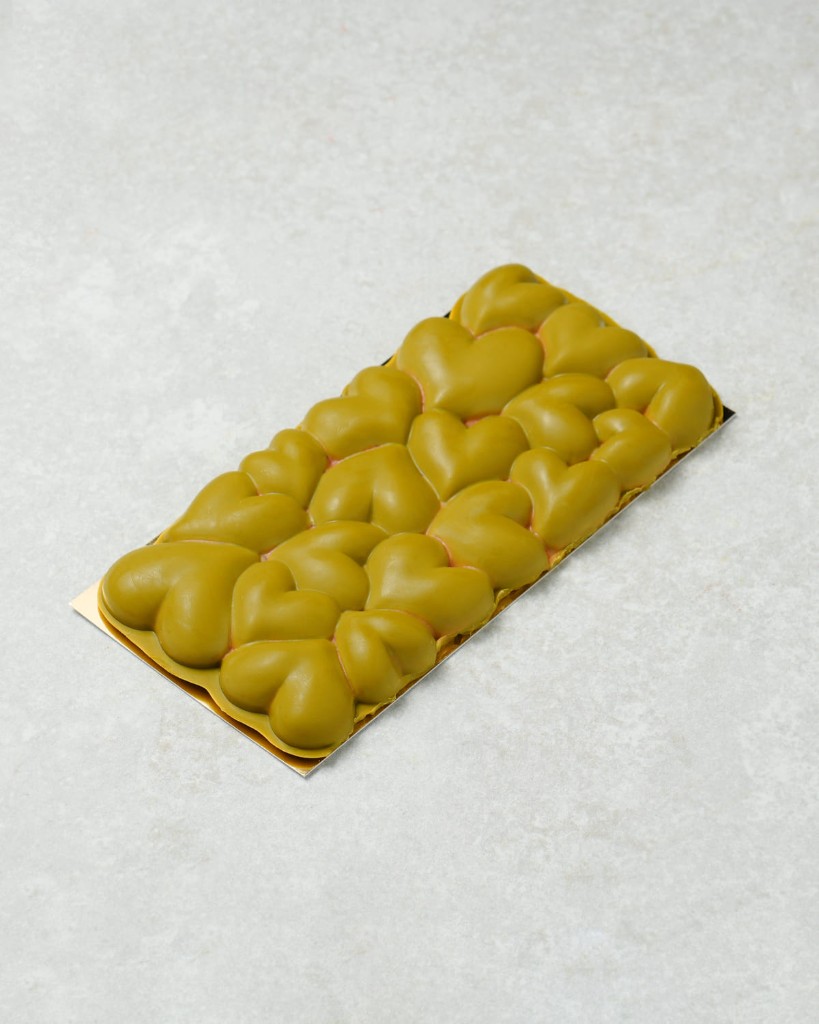 Chocolate de pistacho, relleno de crujiente de frutos rojos.