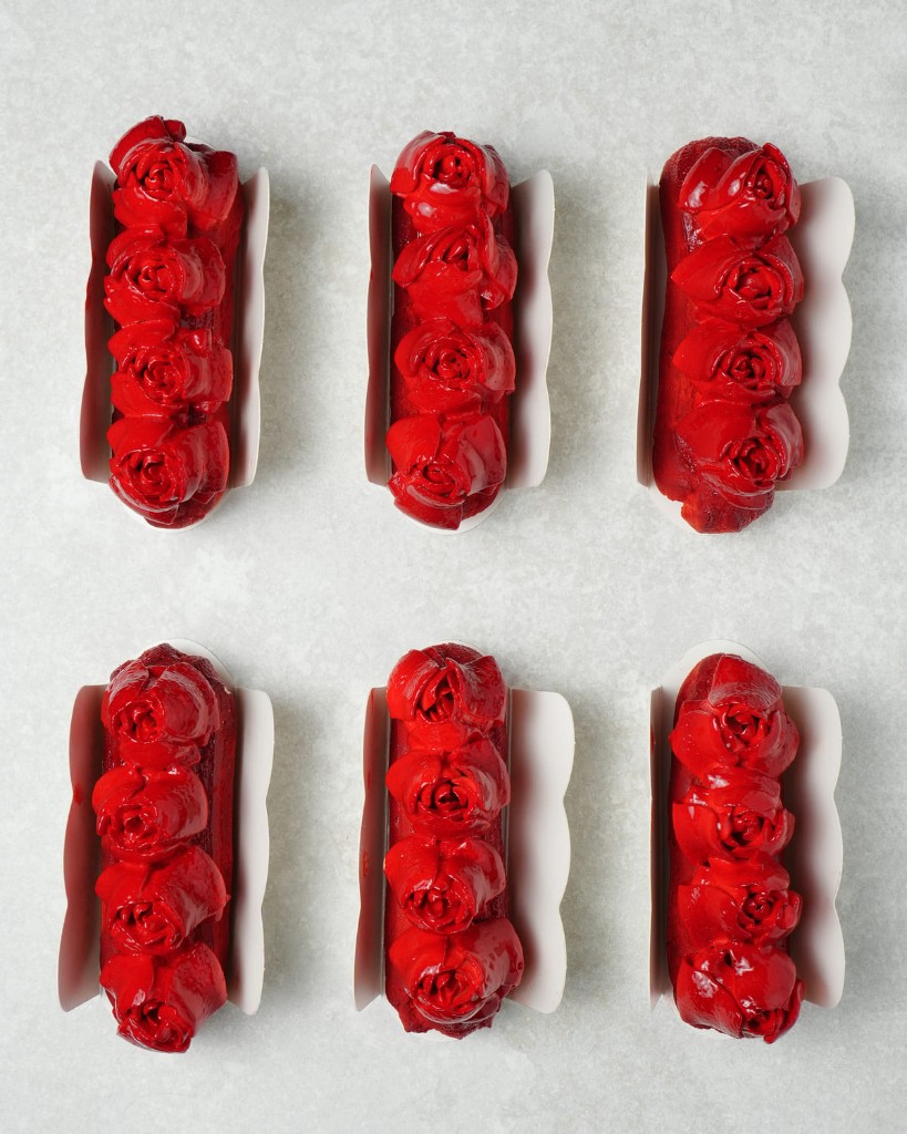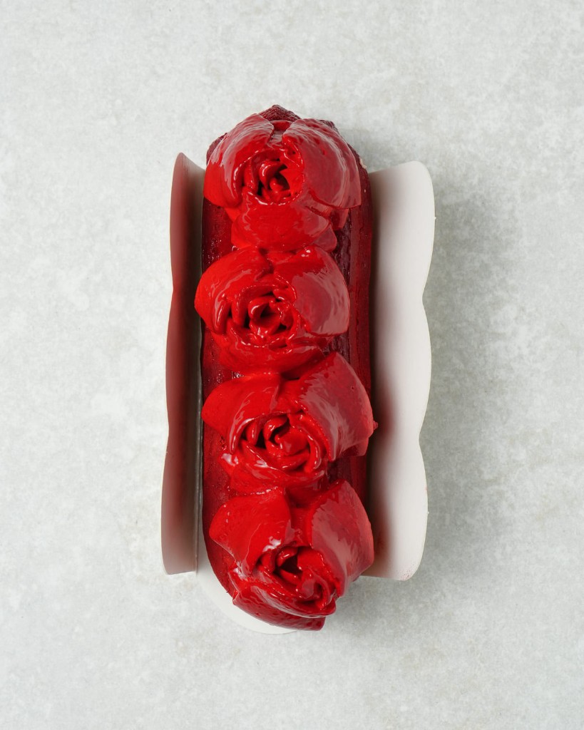 Cremoso de cheescake, mermelada de fresa y ganache de cheescake montada.