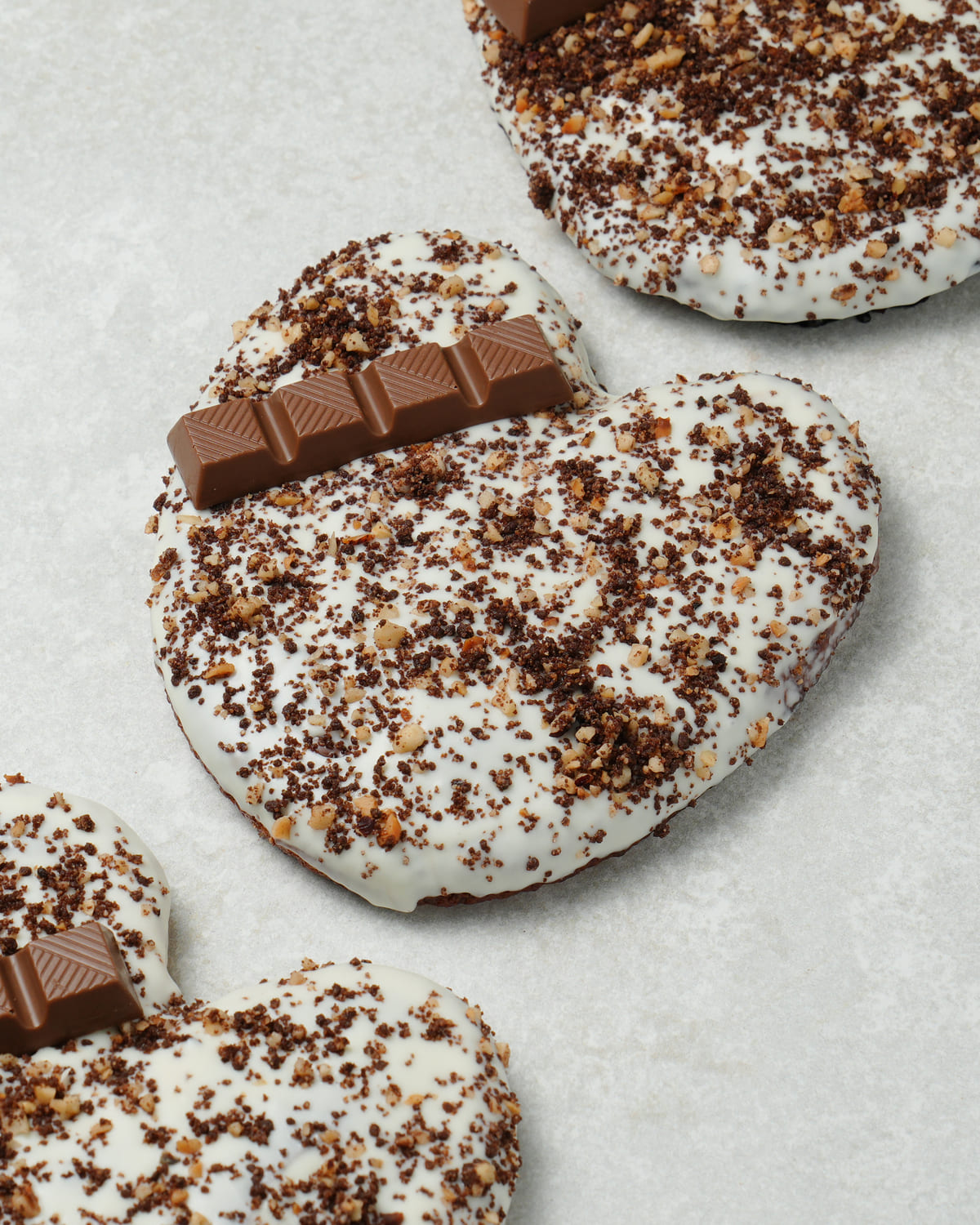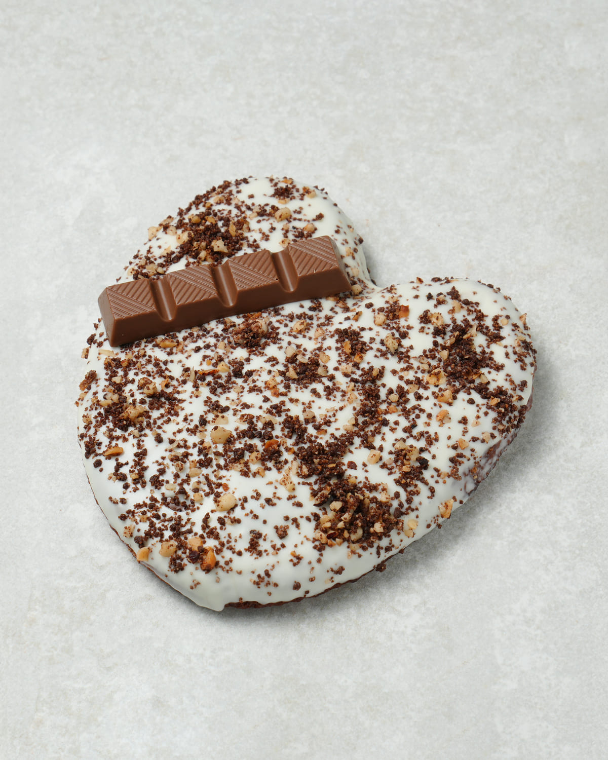 Cremoso de chocolate con avellana, baño de chocolate blanco y crumble de chocolate.